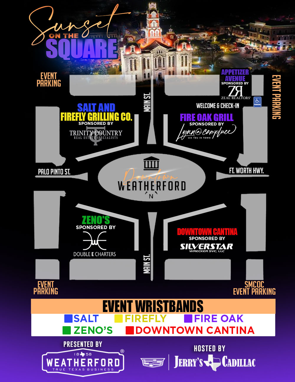 A: Each table host, ticketholder, and/or event sponsor is invited to pick up their ticket packet at Downtown Weatherford Inc’s North Main Street office, located at 224 North Main. In the ticket packet, you will receive a wristband for each guest, day of event instructions, and an event map. Each wrist band is a ticket to the event. The wrist bands are color coded in coordination with the restaurant at which you will be dining.