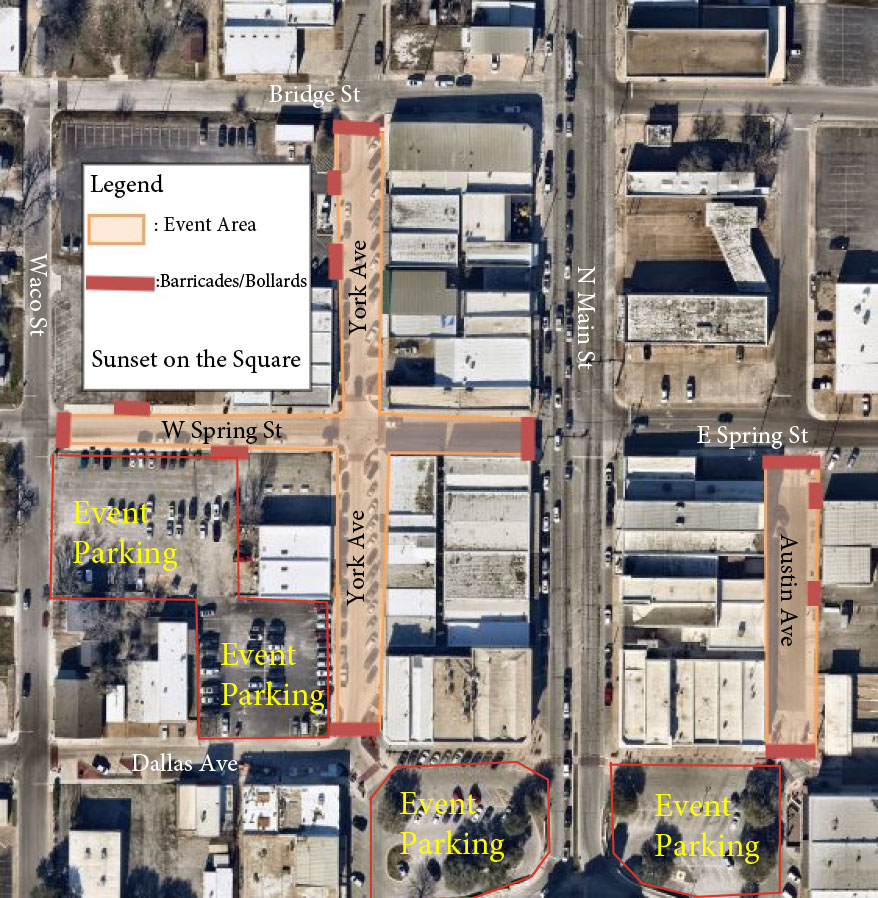 A: There will be EVENT PARKING lots in close proximity to each quadrant, with the most parking available immediately adjacent to Appetizer Avenue. Suggested parking options: B&H Feed, The Junktion, Trinity Country Real Estate, Sparks Antiques, PNC Bank, The District Court parking lot, The County parking lot at York and Dallas, Tates Total Training, Lenny’s Local, East Church Street, Shep’s, and HANDICAP parking will be available on Trinity Avenue (with a parking attendant).